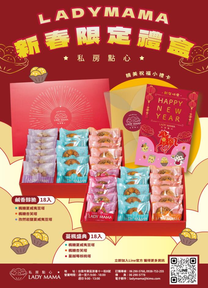 在搜尋「台南甜點宅配推薦」、「台南伴手禮推薦」、「堅果塔哪裡買」時,ladymama私房點心的夏威夷豆塔總會名列前茅,原因很簡單,它不只是甜點,更是一份讓人感受到心意與質感的禮物。不論是過年過節、母親節、聖誕節,甚至是公司尾牙、婚禮喜餅、彌月禮盒等場景,都有越來越多人指定使用ladymama的夏威夷豆塔作為贈禮主角。品牌提供多種禮盒形式,從6入、12入、18入到客製化數量都可選擇,包裝設計簡約雅致,適合各種送禮情境,不論送長輩、朋友還是商業夥伴都非常體面。